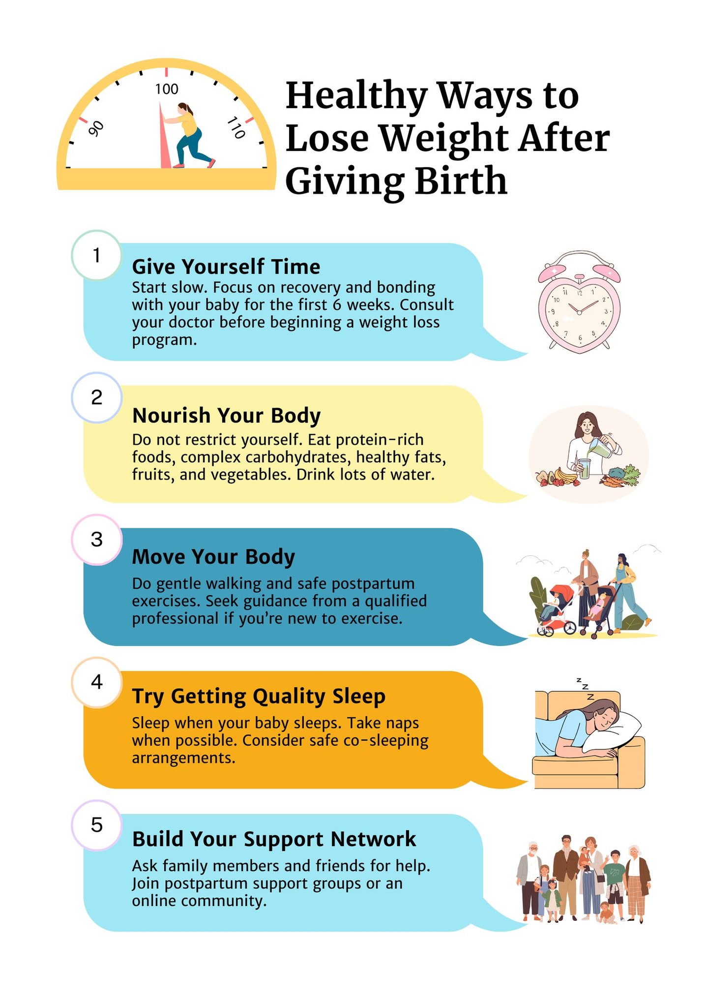 Being healthy overall and in the long term should be the goal instead of simply losing the baby weight to look good. Your postpartum journey is unique. What works best for others may not work for you, and vice versa. Don't feel pressured if someone seems to lose the baby weight more easily. Focus on building long-term healthy habits like proper nutrition, gradual physical activity, adequate rest, and emotional well-being. These can help you achieve your healthiest weight (and your healthiest self!) while embracing your new role as a mother.