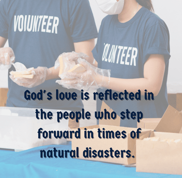 God's love is reflected in the people who step forward in times of natural disasters. He works in their hearts and hands to choose not to look away from the sufferings. This is how God tells us that we are not alone.