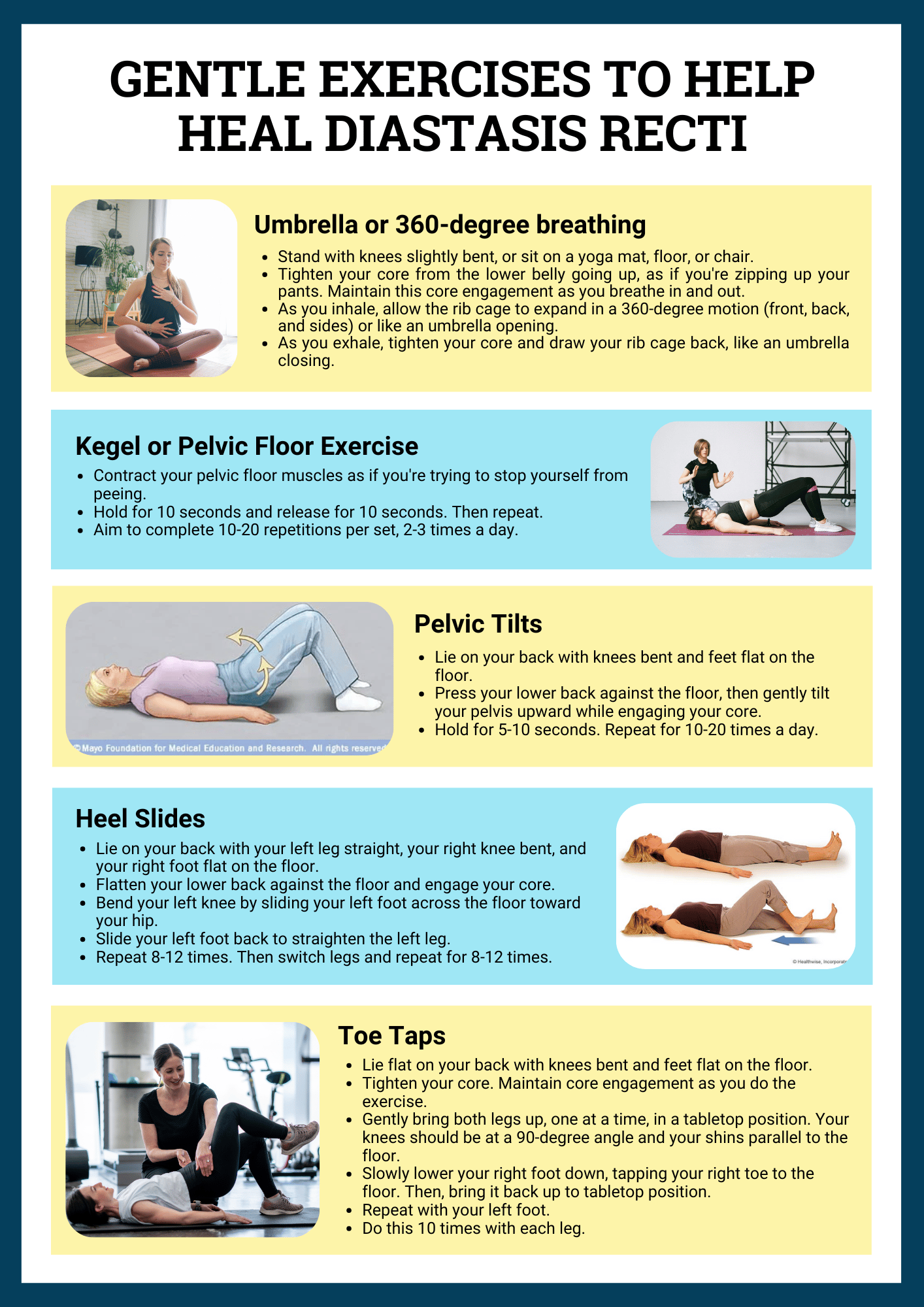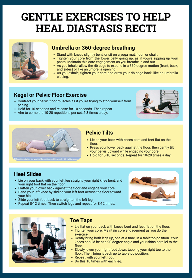 Always remember to start slow. Listen to your body. Rest if you feel tired or have any discomfort. It is best to consult your doctor or a physical therapist specialized in postpartum exercises before starting an exercise regimen.