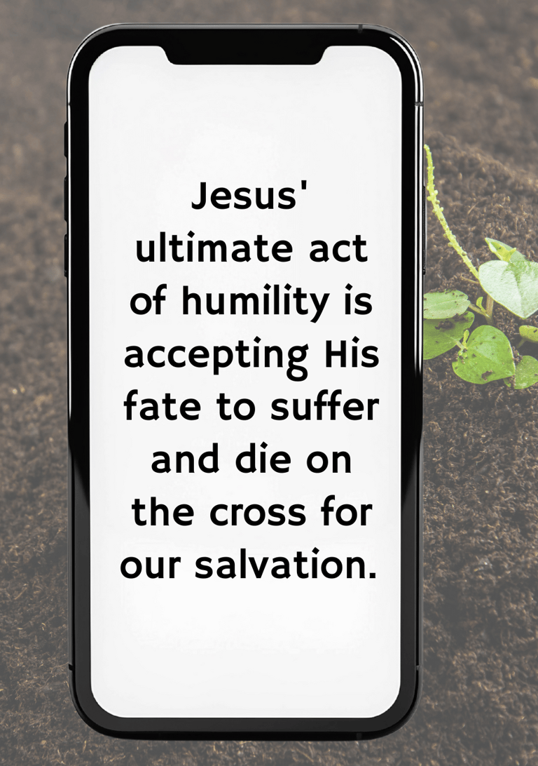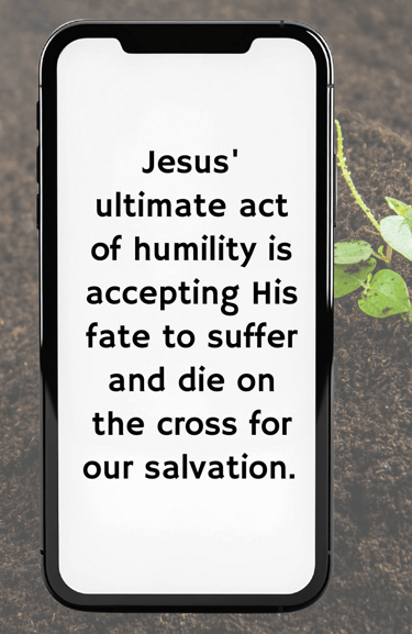 Jesus' ultimate act of humility is accepting His fate to suffer and die on the cross for our salvation. Philippians 2:5-8 perfectly sums up how Jesus lived in humility, "Let the same mind be in you that was in Christ Jesus, who, though he was in the form of God, did not regard equality with God as something to be exploited, but emptied himself, taking the form of a slave, being born in human likeness. And being found in human form, he humbled himself and became obedient to the point of death - even death on a cross."