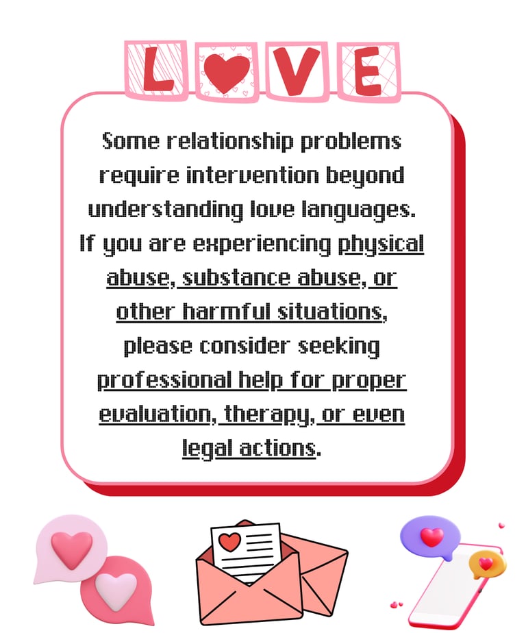 While learning about love languages can help improve relationships, some relationship problems require intervention beyond understanding love languages. Love languages work best in healthy relationships where both people genuinely respect and love each other. If you are experiencing serious concerns such as physical abuse, substance abuse, or other harmful situations, please consider seeking professional help for proper evaluation, therapy, or even legal actions.