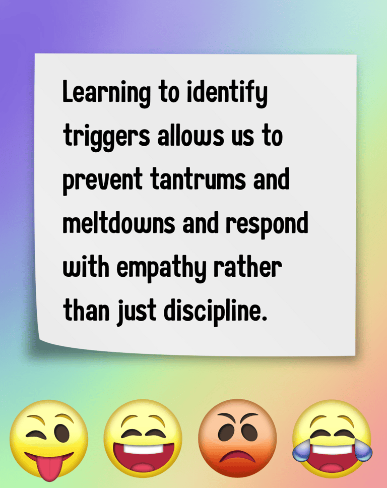 Knowing what triggers helps us understand why tantrums and meltdowns happen. Learning to identify triggers also allows us to prevent tantrums and meltdowns and respond with empathy rather than just discipline.